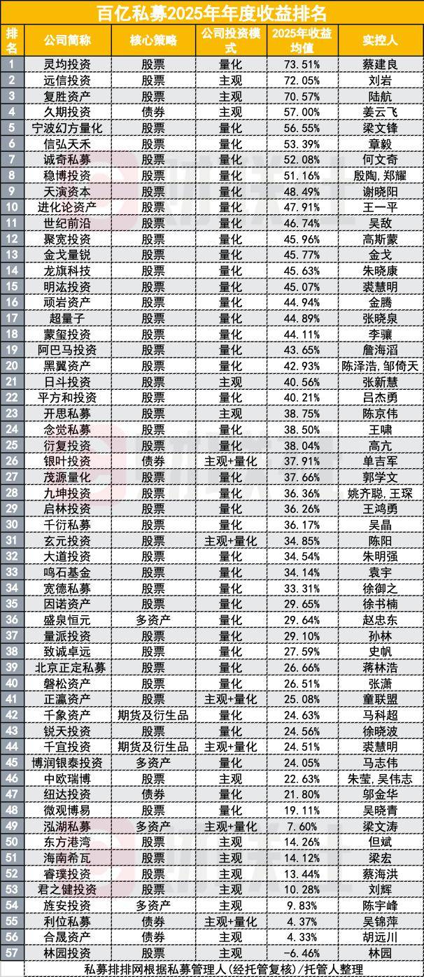 百亿私募排行榜中,灵均投资以73.51%的年度均值拿下冠军,排名二至四名中均为主观多头策略的基金公司,远信投资、复胜投资分别以72.05%、70.57%的回报率取得年度亚军与季军,久期投资年度回报率为57%,排名第四,宁波幻方量化2025年收益均值为56.55%,在百亿私募中排名第五,百亿量化私募中排名第二。